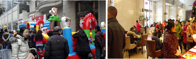 售樓部外那座“從天而降”的童話城堡,著實吸引著孩子們的目光。許多小孩拖著家長,迫不及待的躍入這個可愛的移動城堡中打鬧嬉戲,活力十足的感受著新年的喜悅。家長們似乎也沉浸其中,樂此不疲的看著孩子們嬉笑追逐。當然光有童趣是不夠的,喜樂會還帶來了傳統的中國結DIY,熱情的工藝老師們正悉心的指導熱心的市民如何去編制這美美的中國結。當然你也可以突發奇想,做一個你心目中的時尚中國結。一位老婆婆就正借此機會,用她的巧手展示著她高超驚人的編織技藝,引得圍觀人群贊不絕口。紅紅的中國結,也給這寒冷的第一天帶來了陣陣的暖意。